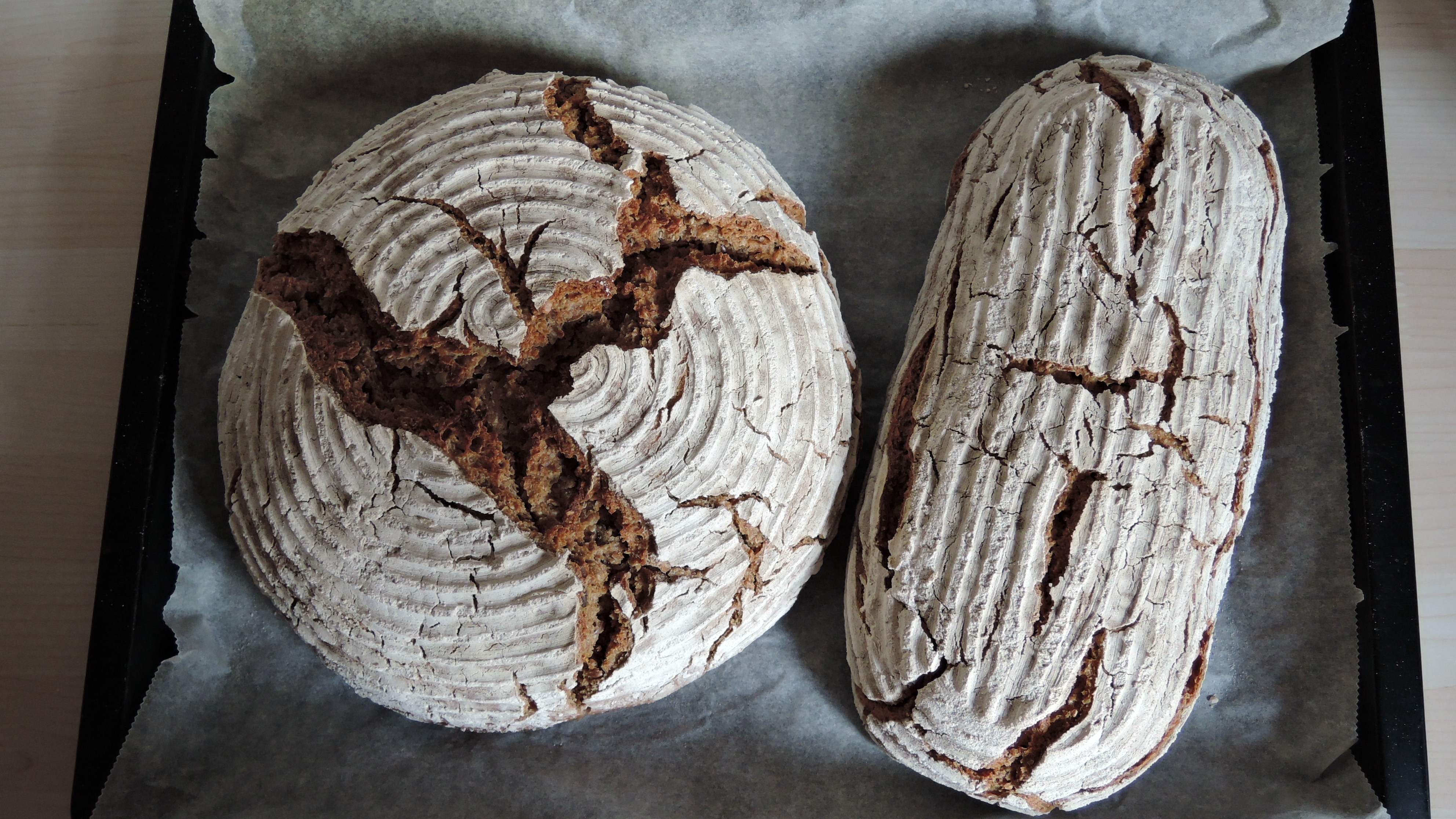 650g whole meal rye-flour, 350g whole meal spelt-flour, two tablespoons of salt, one tablespoon classic bread spice, one tablespoon raw cane sugar, and 750ml of warm water.