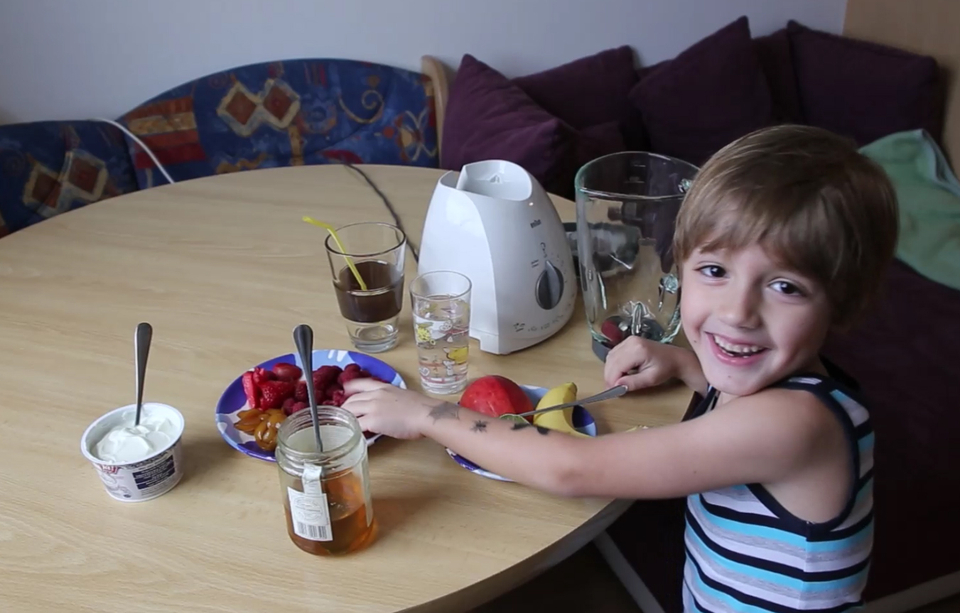 Elias mixes a power drink for children. Rich in vitamins and very delicious!