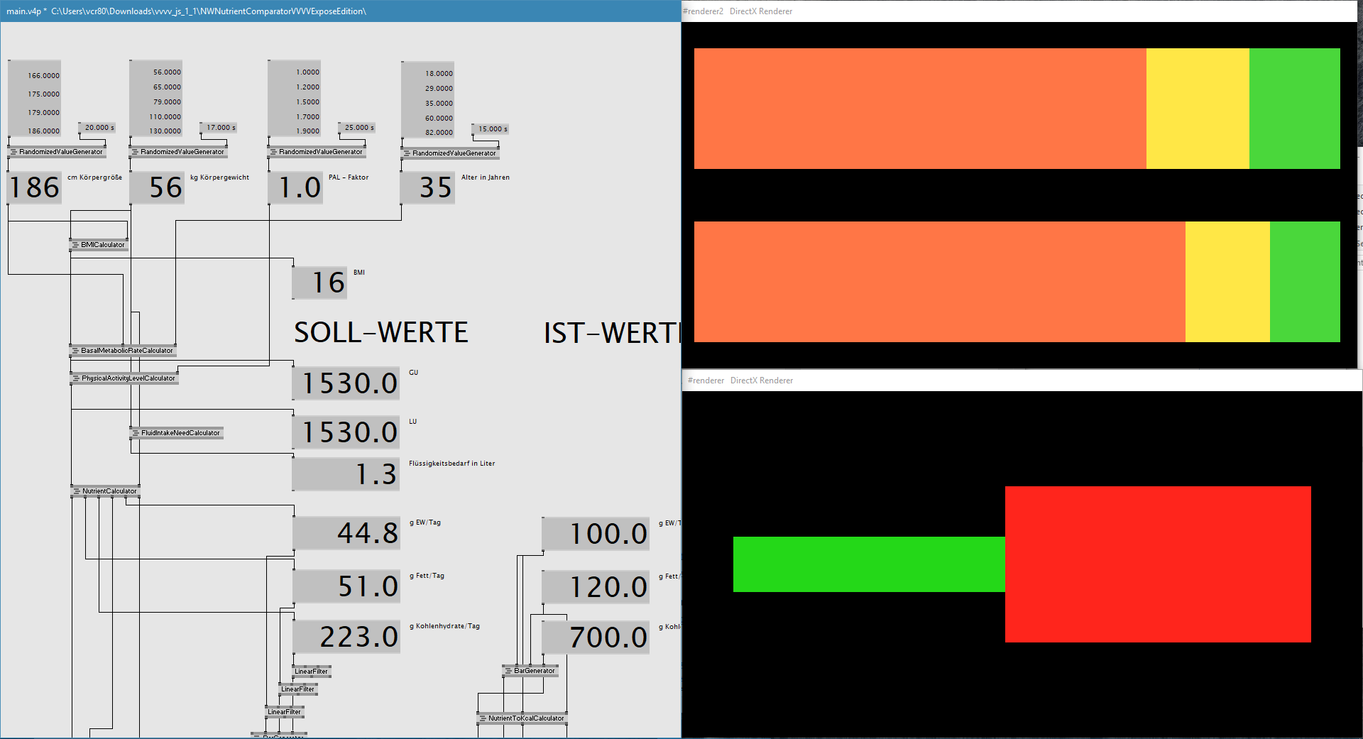 In order to facilitate the process of comparing recommended nutrients with the nutrients actually eaten by a patient this VVVV-patch calculates, using the Harris-Benedict-Formula, the suggested nutrients and compares them with the values entered by a dietitian. It visualizes the results and help the patient understand the difference.