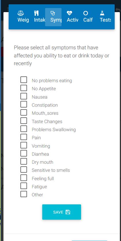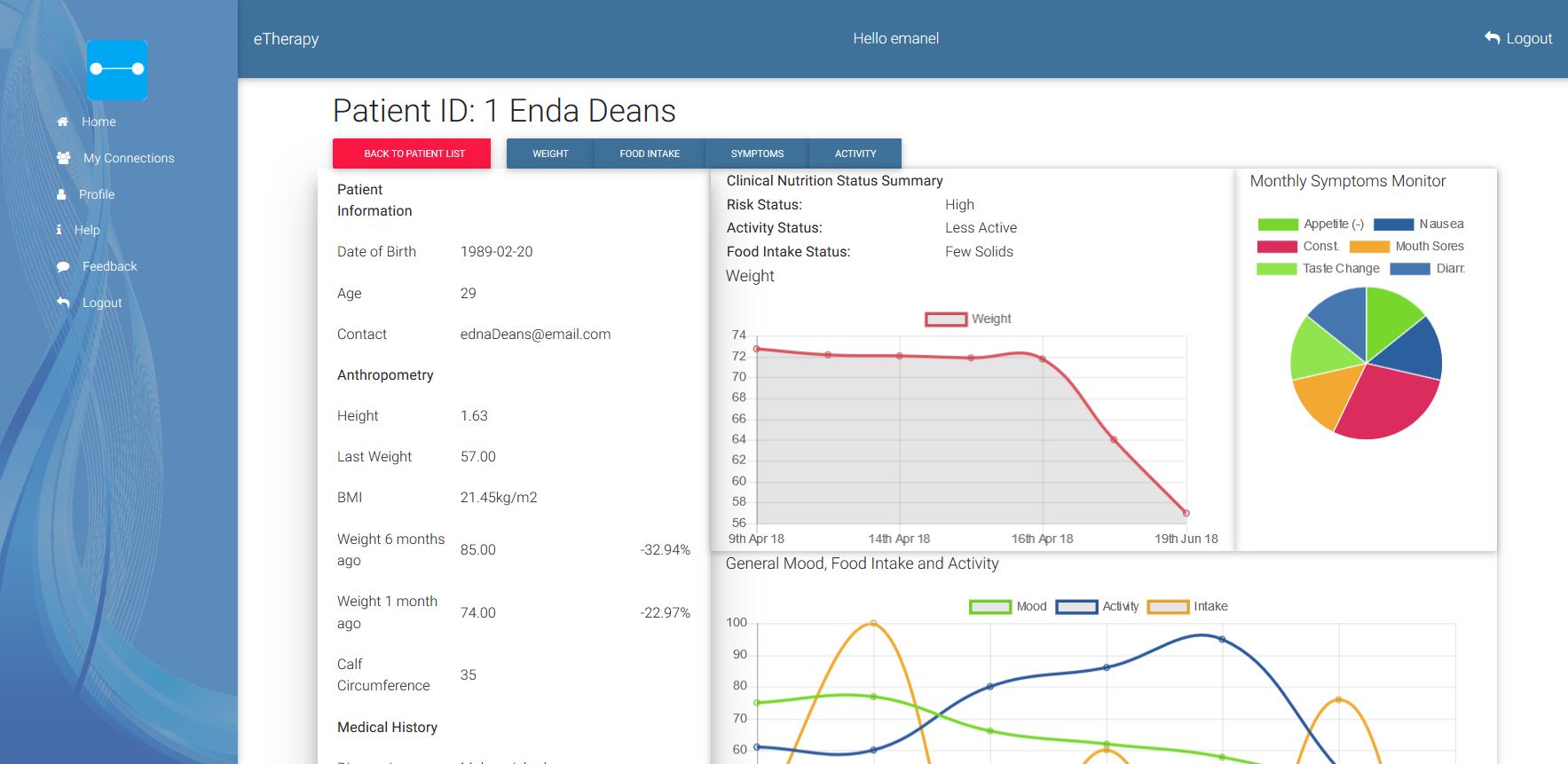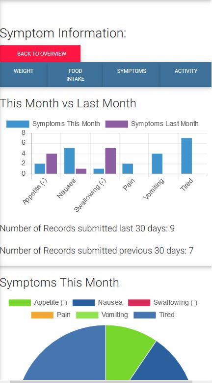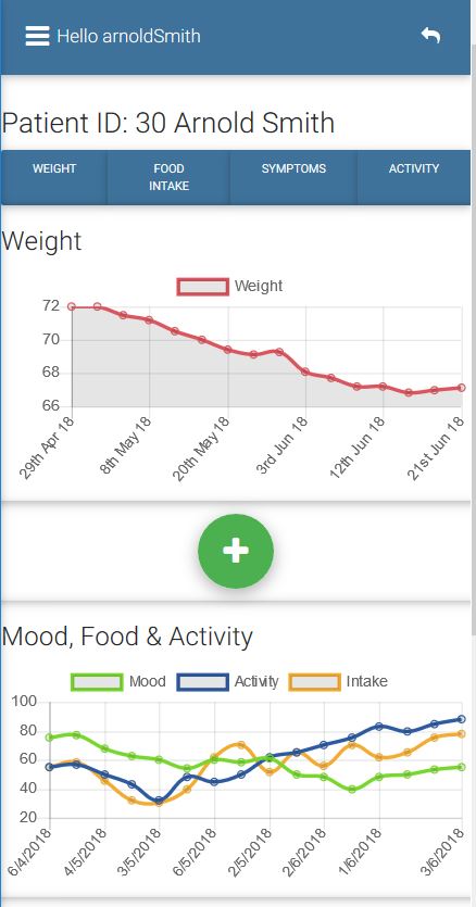Patients can enter key nutrition data such as their weight, food intake, symptoms and activity. In addition, patients are able to securely and easily share their data with their nutrition care provider such as doctor, dietitian, nurse etc. This allows timely malnutrition risk assessment and enhances delivery of nutrition services.